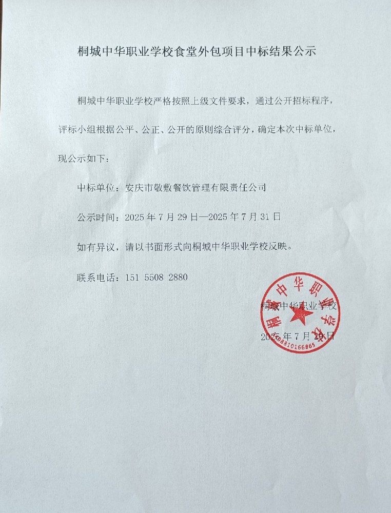 - 2025-0729桐城中华职业学校食堂外包中标结果公示
